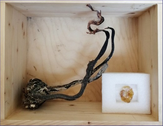 Alarm III / 28 x 23 / wooden box, dried seaweed, oyster shell, foam plastic / 2020