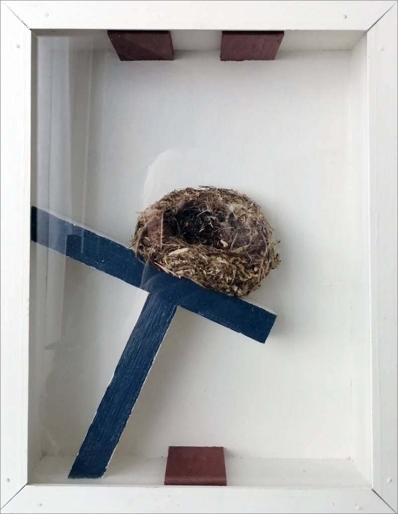 T / bird´s nest behind glas / 31 x 39 x 9 / painted wooden box / – 2023