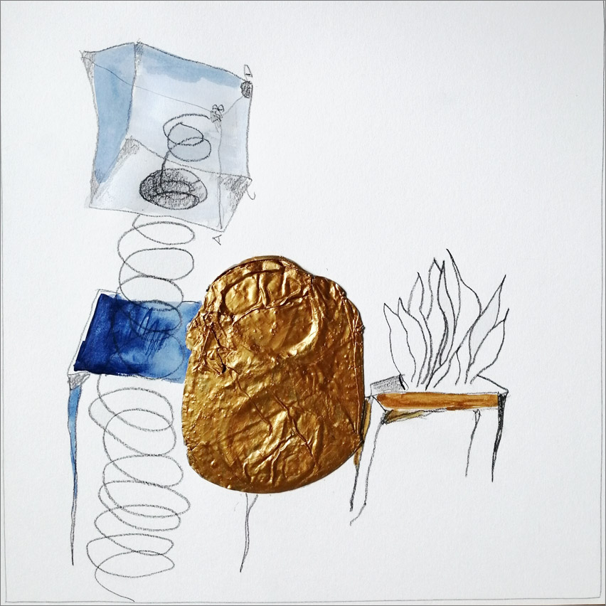 never ending sculpture / 30 x 30 / sketch, tin can, oil, graphite on paper / 2020