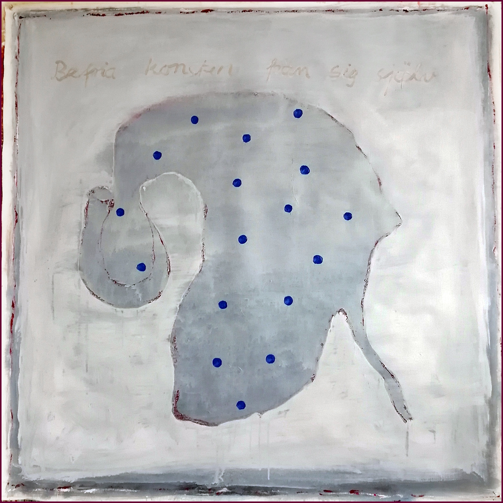 18 blue dots / 100 x 100 / oil, enamel, acrylics / 2024