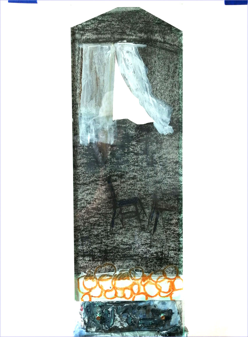 bunker / 58 x 19 / crayon, paper, fabrics, acrylics behind plexiglas / 2014
