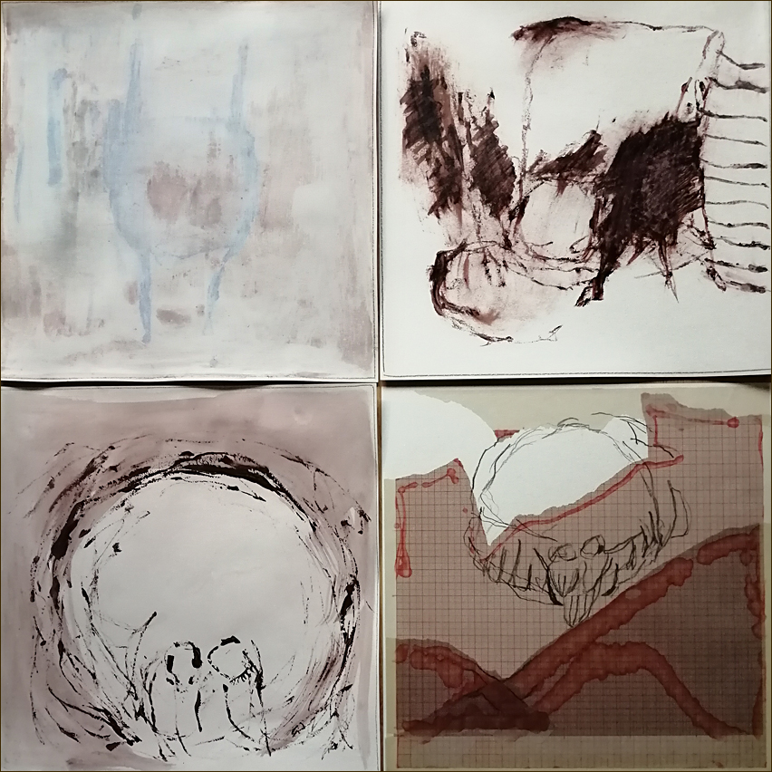 preliminaries / 30 x 30 each / acrylics, graphite, graphic paper / 2019