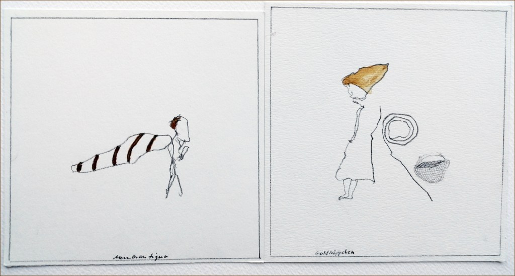 little red cap & membrane thief / 12 x 14 each / pencil, enamel on paper / 2018